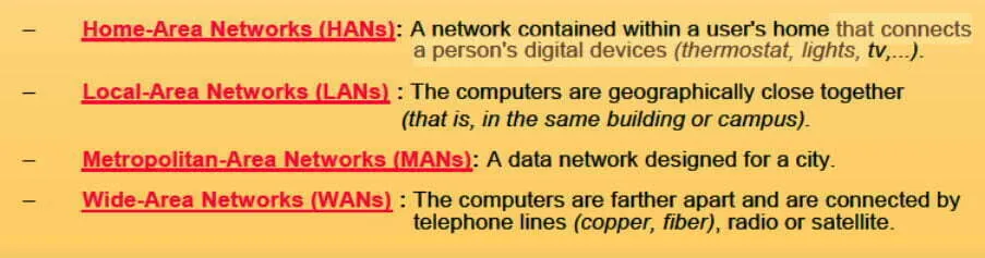 4. Differences between WAN, MAN, LAN, HAN + standard for WLAN